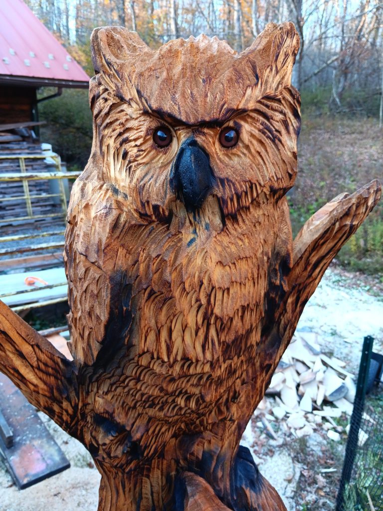 The most varied and customizable of our products, standing log carvings are fashioned from carefully selected logs that best accommodate the design in mind and, as a finished product, are capable of both standing in place and being easily moved to another location. Some carvings are fashioned from a single piece of wood; others require three or more. We’re always expanding our carving repertoire, and this type of carving gives us the freedom to both reproduce our favorite designs and create different subjects with our chainsaws.